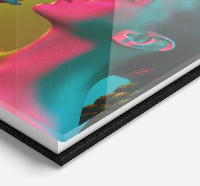 A combinação da capa em acrílico com o revestimento de alta qualidade em pele sintética torna este álbum digital único. A capa feita em acrílico proporciona uma luminosidade intensa, brilho de cor e um efeito de profundidade impressionante.