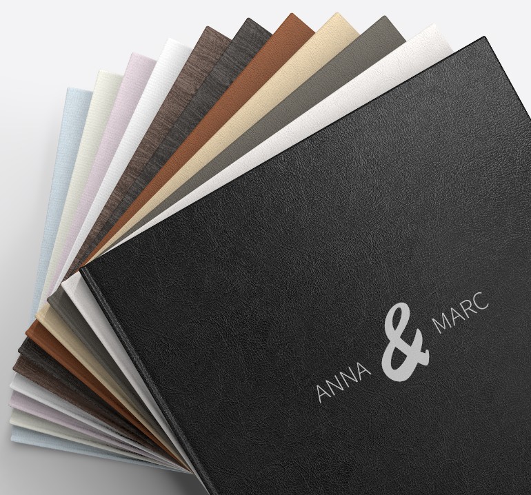 O álbum digital da Linha Profissional oferece várias opções de capa com acabamentos em pele e superfícies especiais, tais como linho ou madeira. As superfícies podem ser desenhadas com texto e cliparts.